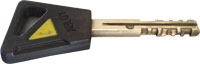 2. Ключ для цилиндрового, штифтового замка так называемой повышенной секретности производства завода Мосренген, Оренбургский-машзаводской. Секретность замка на самом деле не велика. Вскрывается такой замок всеми известными способами, самый простой из них это подбор ключа. Замки данного типа предназначены для помещений, не имеющих материальных ценностей. Наличие такого замка в квартирной двери не защищает её, а наоборот притягивает вора простотой вскрытия. Ключ можно смело оставлять у двери под ковриком так как такой замок может остановить только "чесного человека". Время бесшумного вскрытия замка преступниками 2-3 минуты.